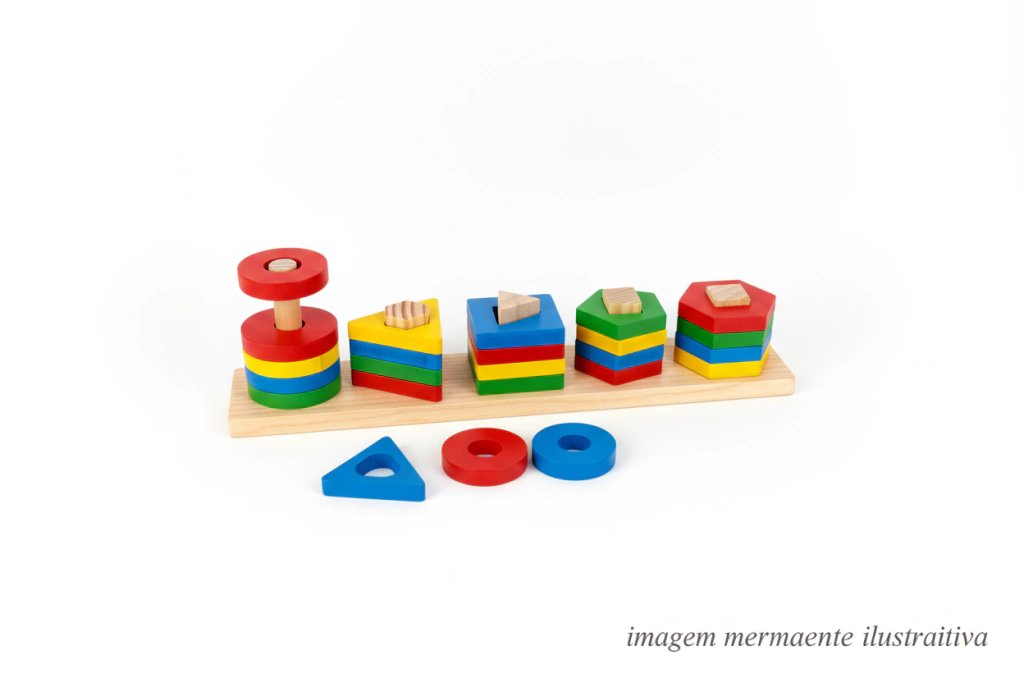 O kit é composto por uma base de madeira com pinos e quatro conjuntos de peças: círculo, triângulo, quadrado e hexágono. Cada conjunto apresenta peças coloridas empilháveis, permitindo que a criança organize, compare, encaixe e reconstrua da forma que quiser. É um brinquedo que estimula autonomia, foco e raciocínio desde cedo.