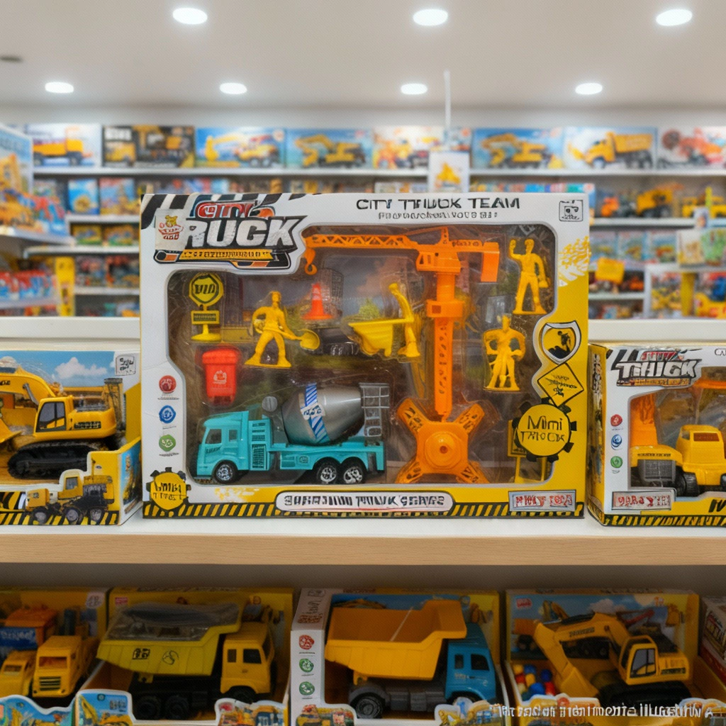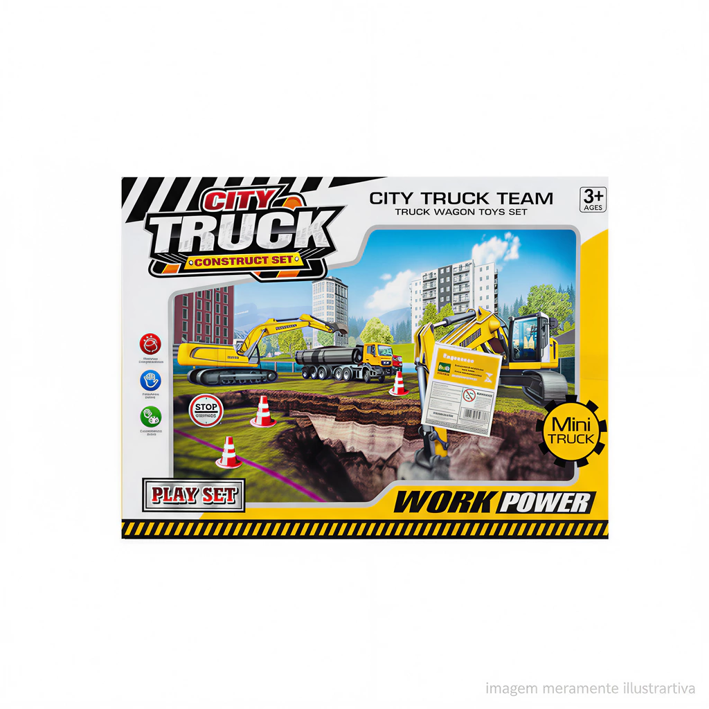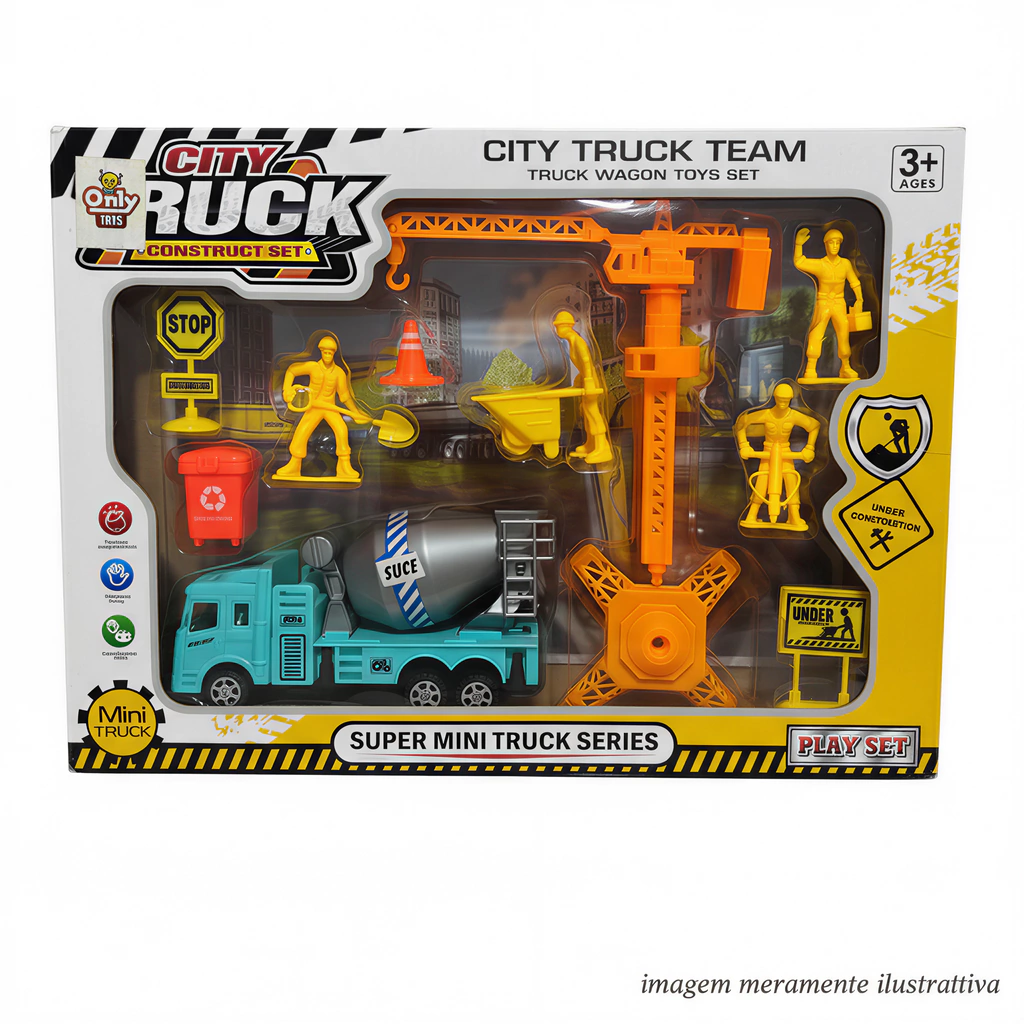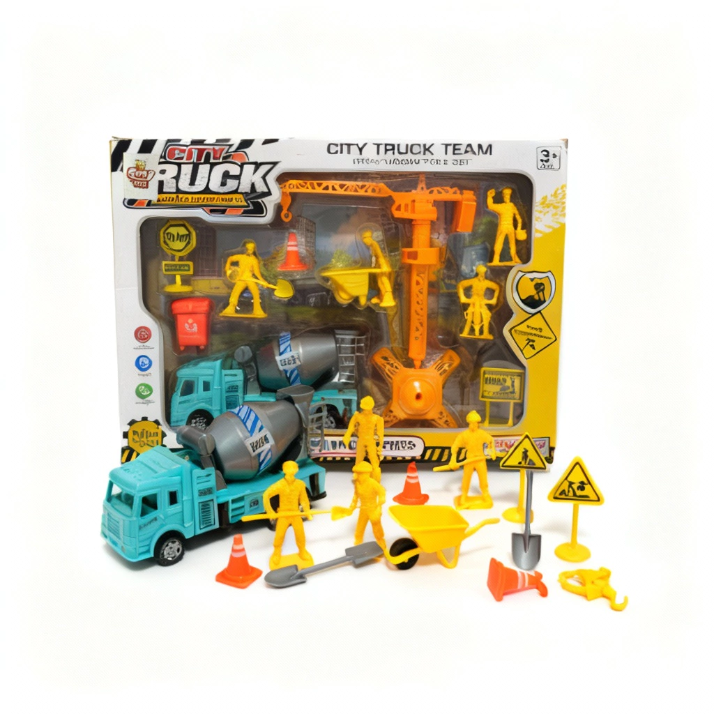 Apresentamos o Conjunto CITY TRUCK TEAM da Super Mini Truck Series - o kit perfeito para crianças que adoram veículos de construção e querem criar seu próprio canteiro de obras! Com múltiplos veículos, operários e acessórios, este playset oferece horas de diversão imaginativa e educativa!
