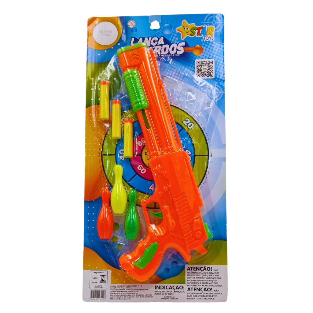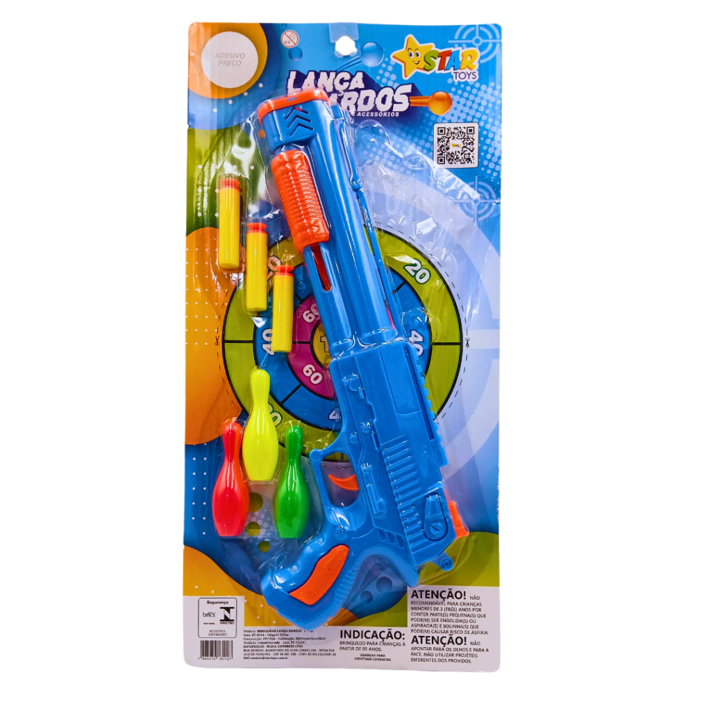 O kit acompanha uma super pistola lançadora, dardos com ponteiras em EVA, pinos coloridos e um alvo ilustrado – tudo para estimular jogos que desenvolvem habilidades motoras, concentração e foco. Ao tentar derrubar os pinos ou acertar o centro do alvo, a criança trabalha coordenação entre olho e mão, controle de força e raciocínio espacial.