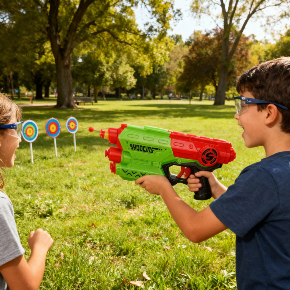 BENEFÍCIOS: Desenvolve Coordenação Motora - Aprimora a mira e concentração Estimula Competição Saudável - Sistema de pontuação nos alvos 100% Seguro - Inclui óculos de proteção para brincadeira tranquila Cores Vibrantes - Design atraente que as crianças adoram Diversão em Família - Para brincar sozinho ou com amigos