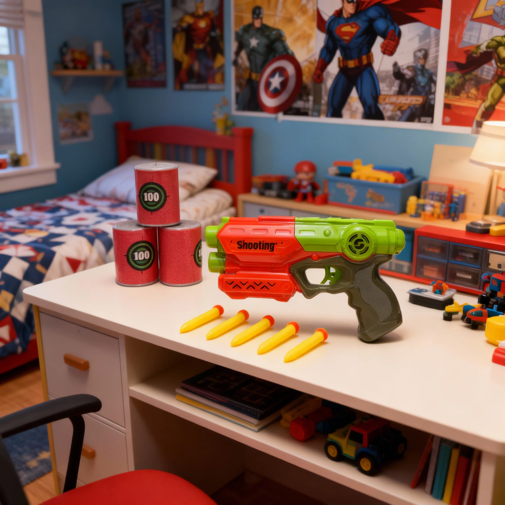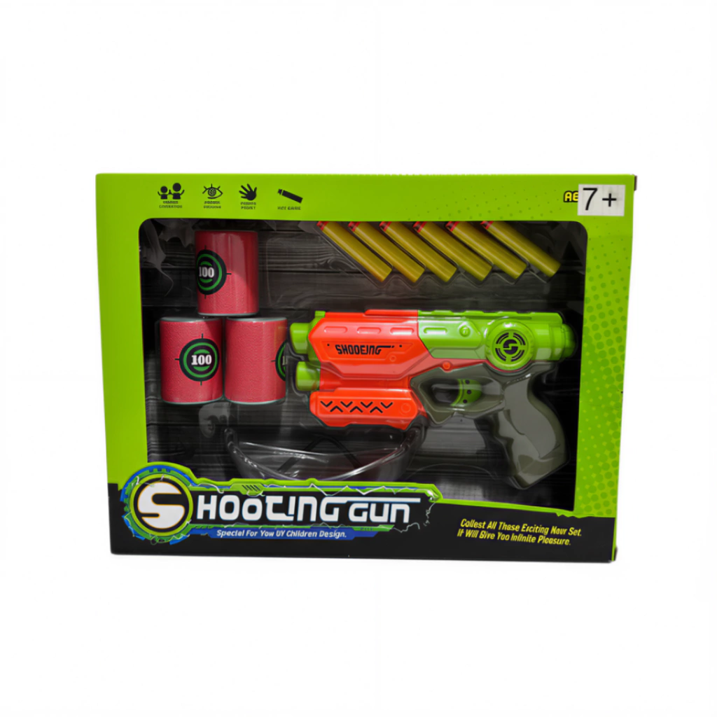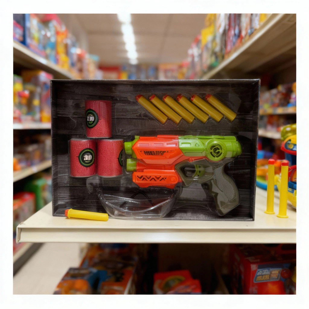 O QUE VEM NO KIT: 1 Pistola Lançadora (laranja e verde vibrantes) 6 Dardos de Espuma com ponta de segurança 3 Alvos vermelhos com pontuação (100 pontos cada) 1 Óculos de Proteção transparente Design ergonômico e colorido especialmente para crianças