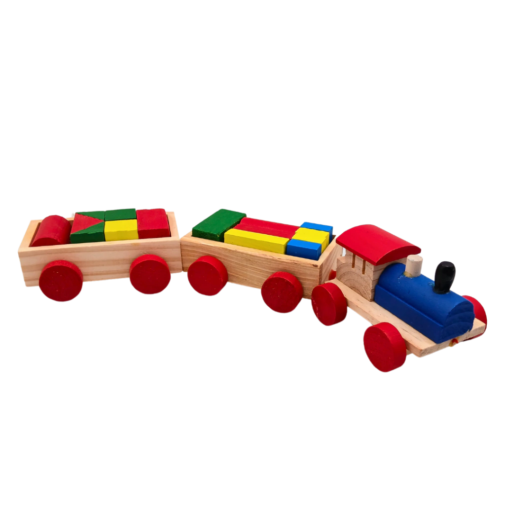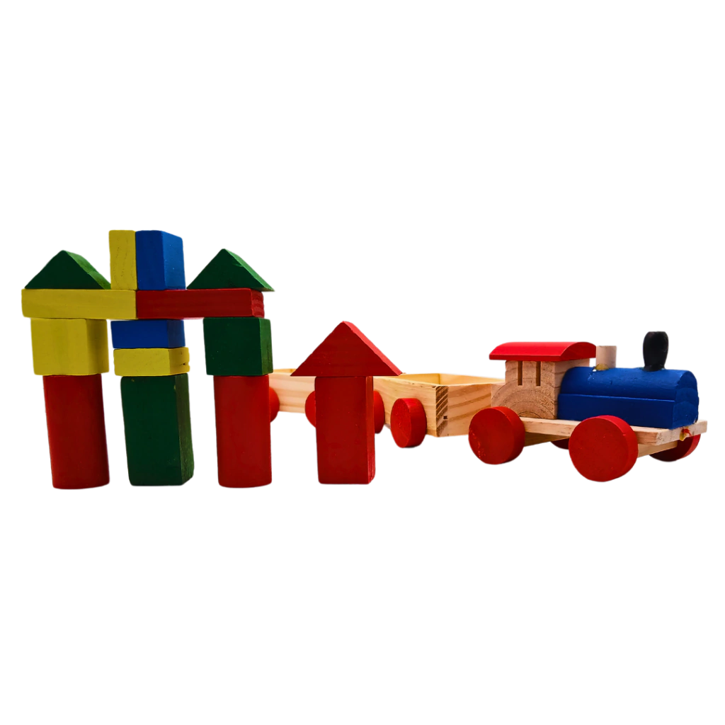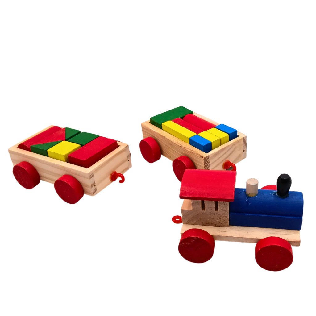 Cada vagão do trem carrega blocos geométricos coloridos que podem ser empilhados, desmontados e reorganizados, incentivando a coordenação motora fina, percepção espacial, reconhecimento de formas e cores, além de despertar a imaginação por meio da construção criativa. Ao movimentar o trem, os pequenos também desenvolvem noções de causa e efeito, coordenação entre mãos e olhos, e até mesmo habilidades sociais quando a brincadeira é compartilhada com irmãos ou amigos.